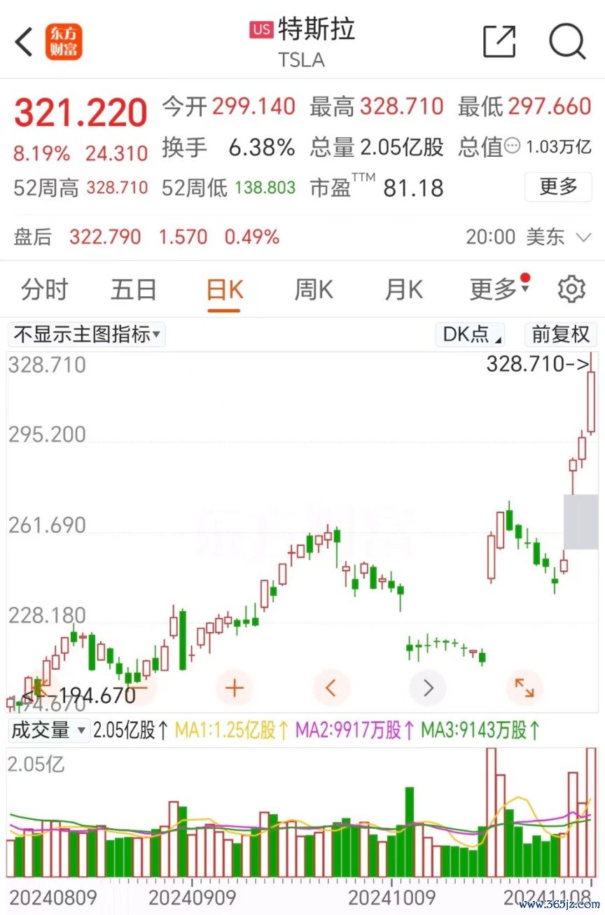 而受益特朗普交易的还有特斯拉。周五特斯拉股价强劲上涨,盘中涨幅一度扩大至10%以上,创2022年4月以来新高。收盘仍涨超8%,推动其市值重新突破万亿美元大关,达到1.03万亿美元。